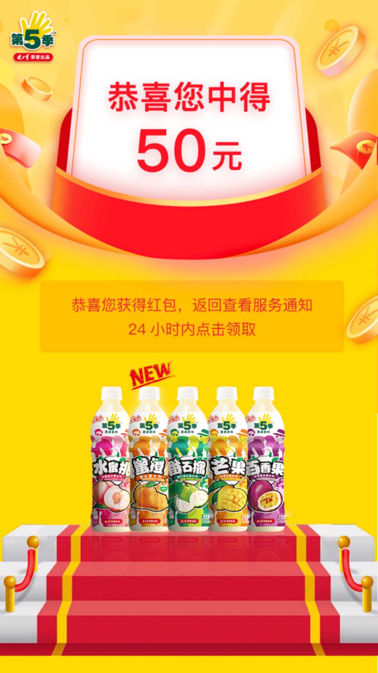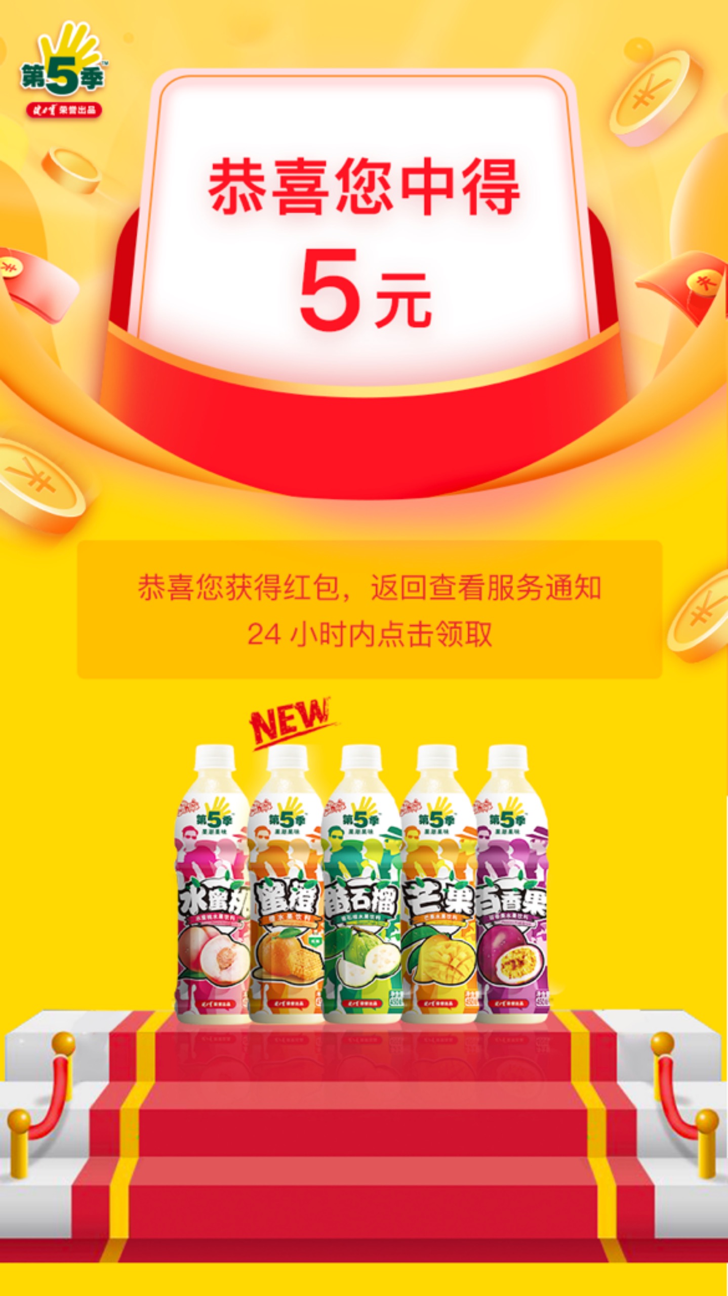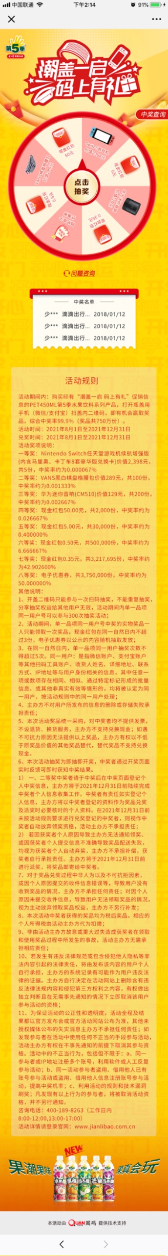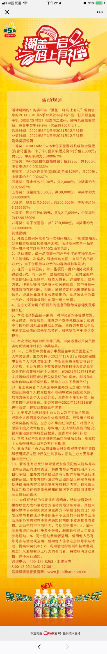 活动期间内:购买印有“潮盖一启 码上有礼”促销信息的PET450ML第5季水果饮料系列产品,打开瓶盖用手机(微信/支付宝)扫盖内二维码,即有机会赢取奖品,综合中奖率99.9%(奖品共750万份)。