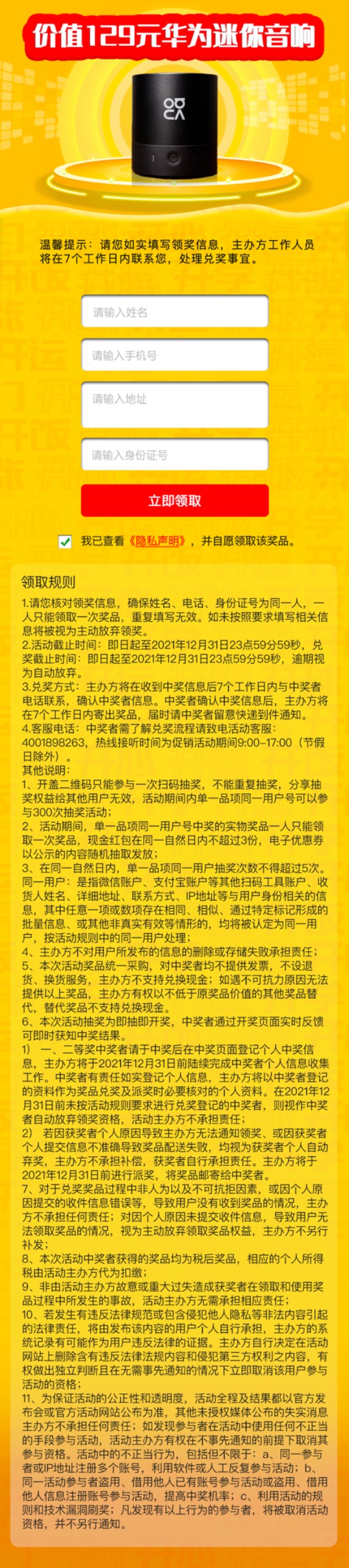 一、二等奖中奖者请于中奖后在中奖页面登记个人中奖信息,主办方将于2021年12月31日前陆续完成中奖者个人信息收集工作。中奖者有责任如实登记个人信息,主办方将以中奖者登记的资料作为奖品兑奖及派奖时必要核对的个人资料。在2021年12月31日前未按活动规则要求进行兑奖登记的中奖者,则视作中奖者自动放弃领奖资格,活动主办方不承担责任;