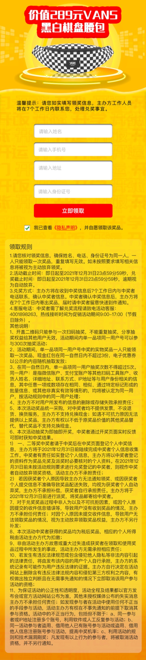 二等奖:VANS黑白棋盘格腰包价值289元,共100份,中奖率约为0.001333%